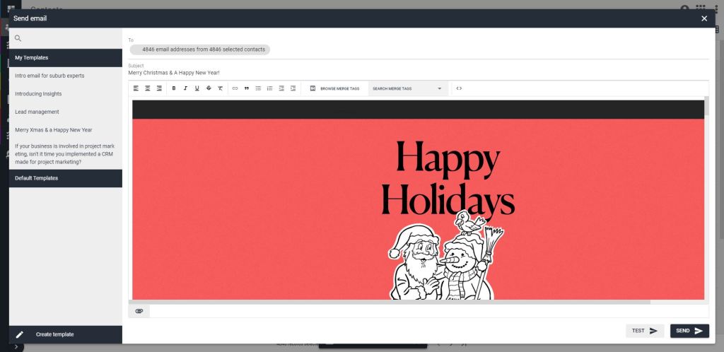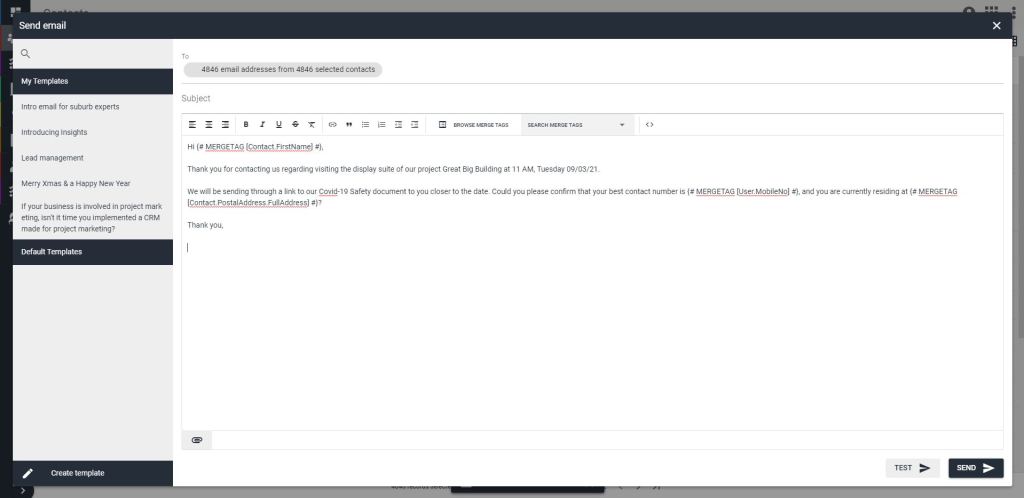 After selecting the people you wish to contact, open the ‘Email’ screen. From here, you can begin to put your email together. As in the examples below, you might choose to simply send off a brief message to whoever you may be contacting (in the example below, regarding a display suite visit). You might also choose to send an email off to quite a few people, using merge tags to create a personalised look and feel. You might also choose to send off a marketing-approved email template on certain holidays or to announce new projects coming to market.